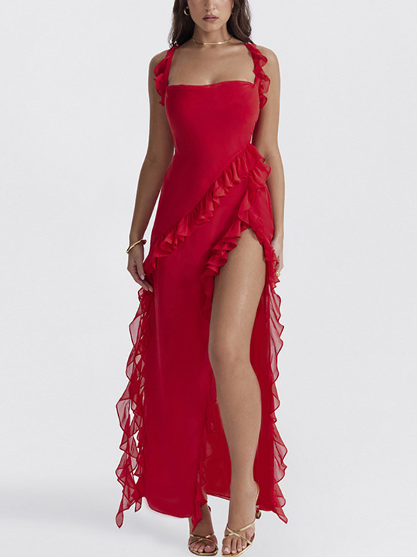 Solid Ruffled Trim High Split Maxi Dress