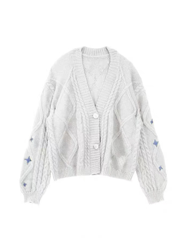 Star Embroidered Print Cable Knit V Neck Cardigan