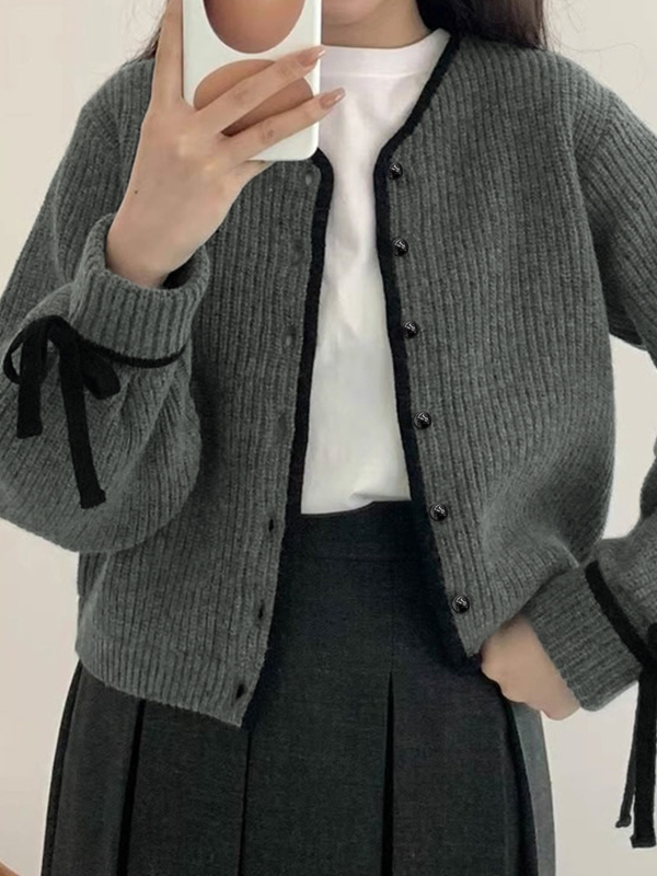 Contrast Trim Bow Decor Knit Cardigan