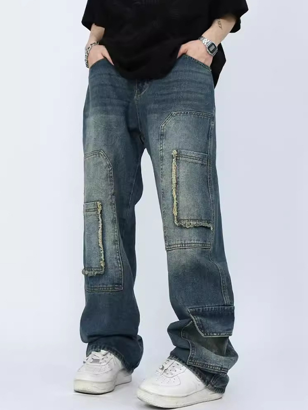 Men’s Vintage Distressed Splice Whisker Wash Loose Jeans