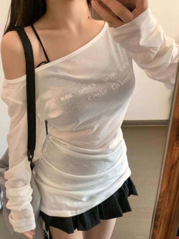 Letter Print One Shoulder Thin Long Sleeve Tee